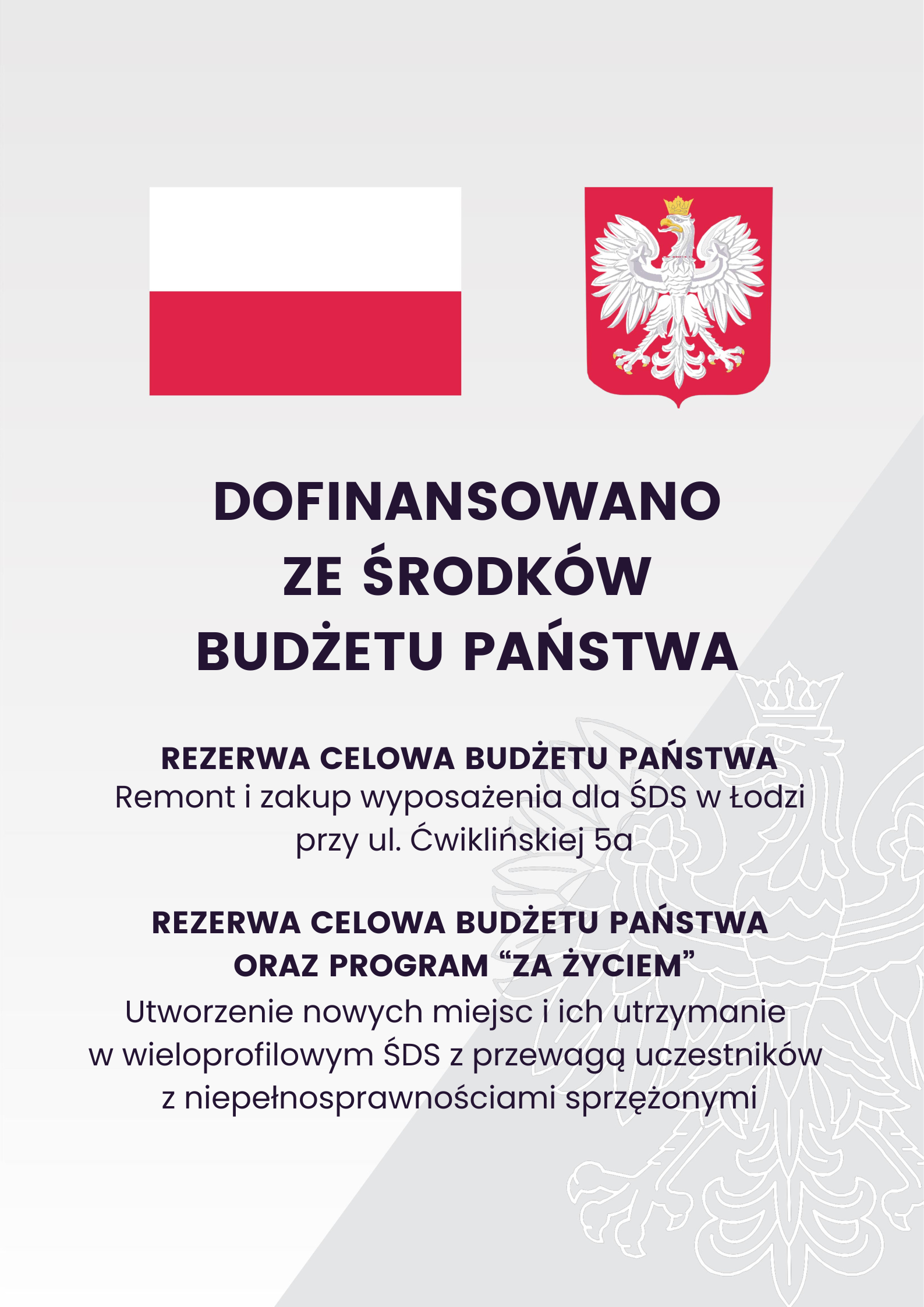 Dofinansowanie z rezerwy celowej budżetu państwa oraz programu „Za życiem” na remont i zakup wyposażenia dla ŚDS w Łodzi przy ul. Ćwiklińskiej 5a oraz na utworzenie nowych miejsc i ich utrzymanie w wieloprofilowym ŚDS z przewagą uczestników z niepełnosprawnościami sprzężonymi.